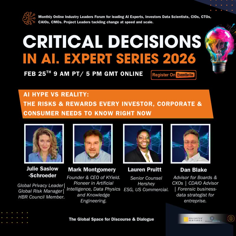 Critical Decisions in AI Symposium 2 - Julie Schroeder (HBR Council, Top 25 Global Privacy Expert) delivers the keynote on AI Hype vs Reality, followed by expert panel discussions with Mark Montgomery (KYield Founder & CEO), Lauren Pruitt (Senior Counsel, Hershey), and Dan Blake (Forensic Business-Data Strategist).